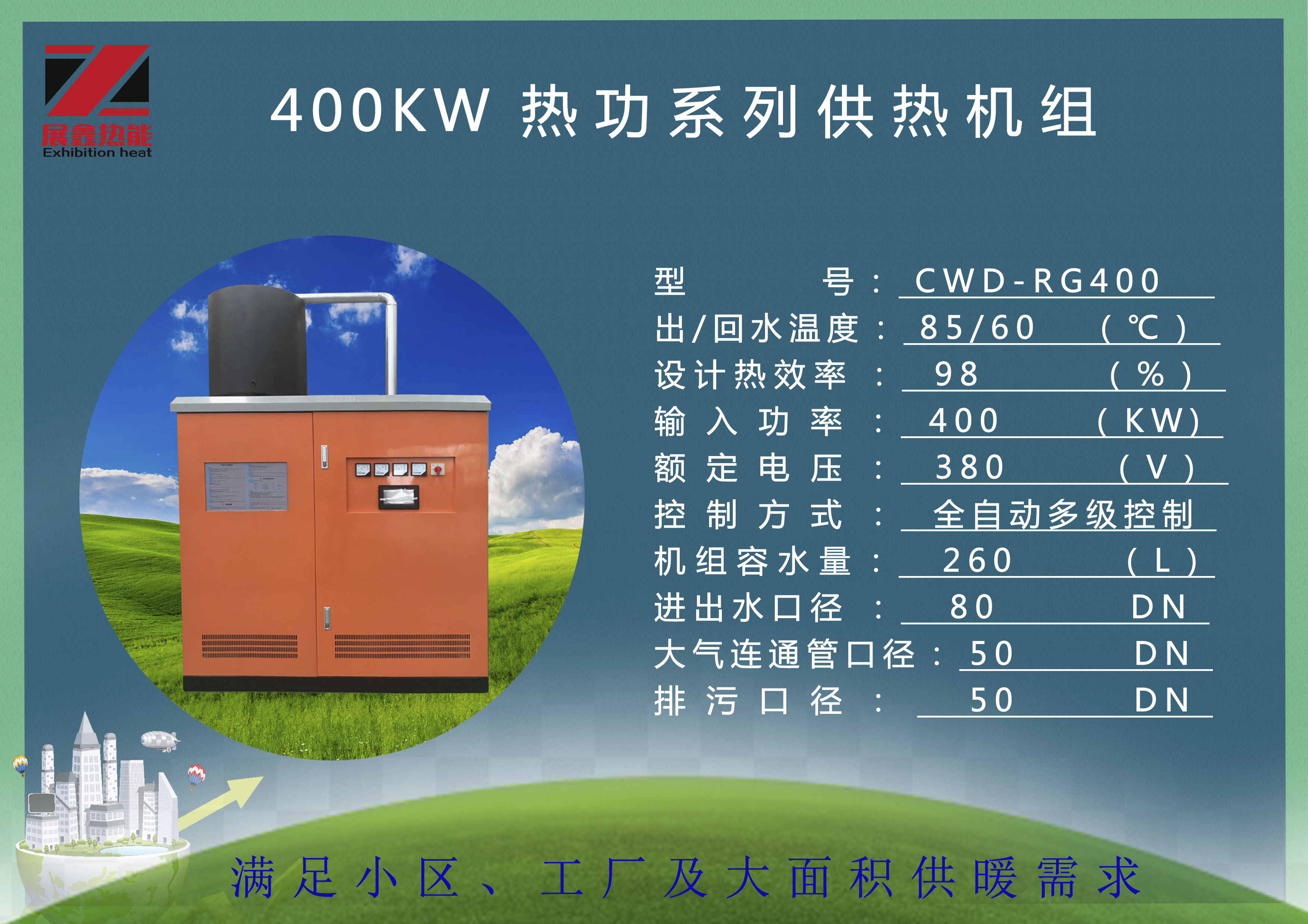 展鑫400KW电锅炉用于室内风盘供热时可供暖5000平米:微电脑控制,根据需要,功率和温度可调,独创微承压贯流换热结构设计,更适合风机盘管快速持续供热,室内温度升温快。